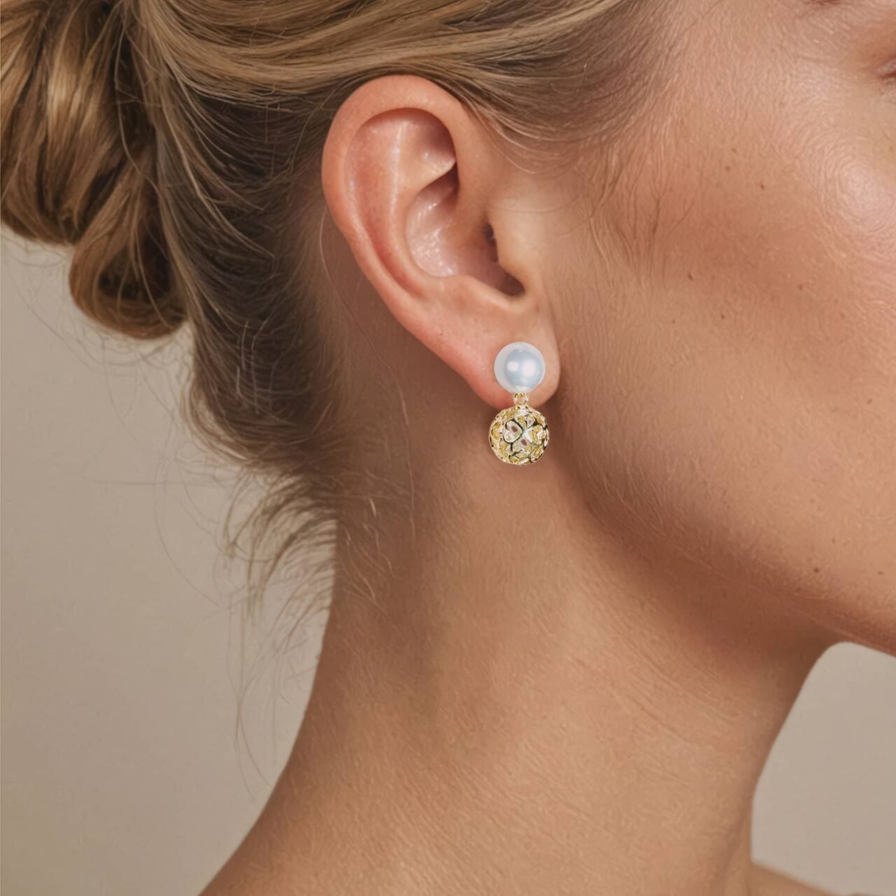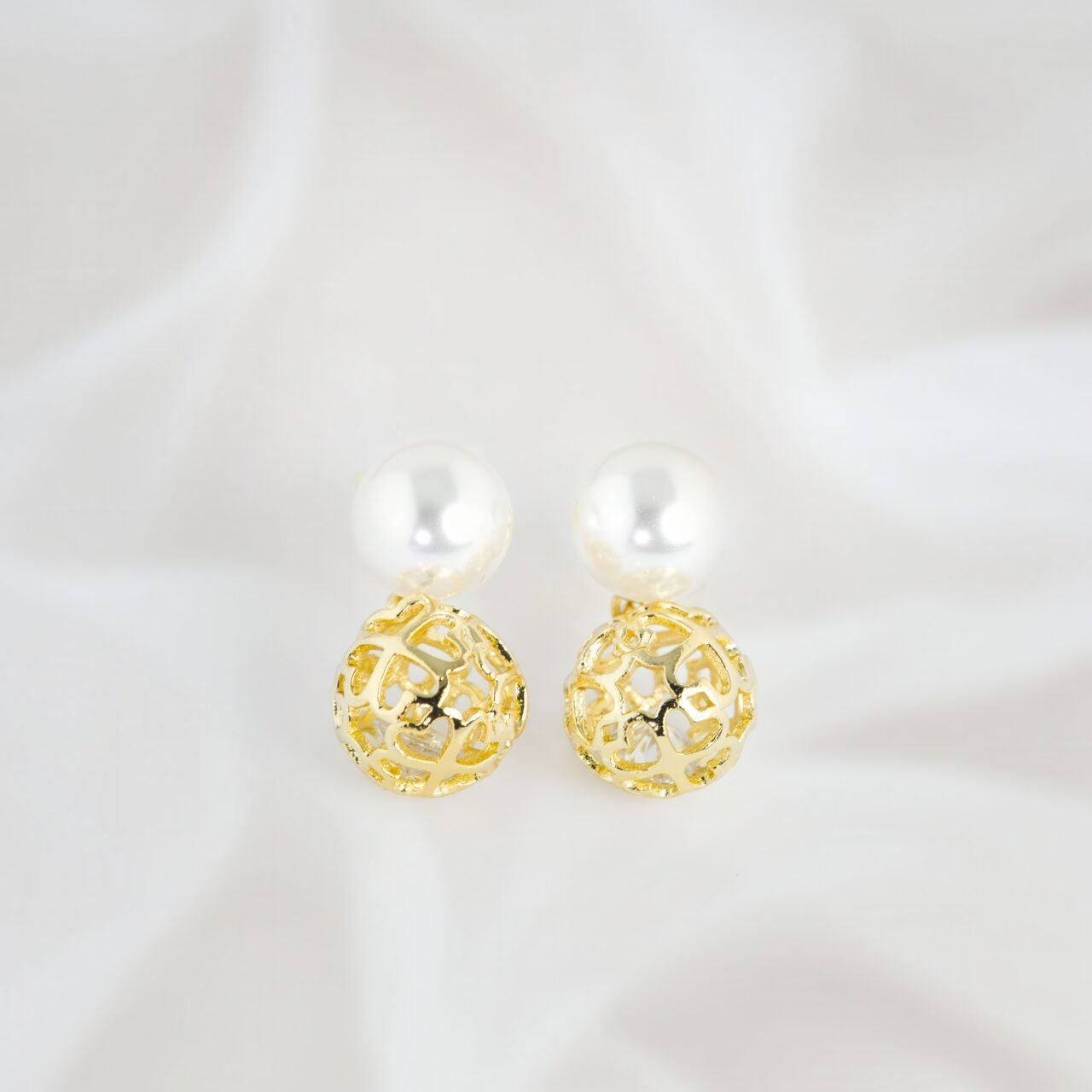 Discover the timeless elegance of our gold and pearl drop earrings. Each earring features a stunning white pearl paired with an intricately designed gold heart-shaped filigree sphere, conveys a message of boundless love and affection.