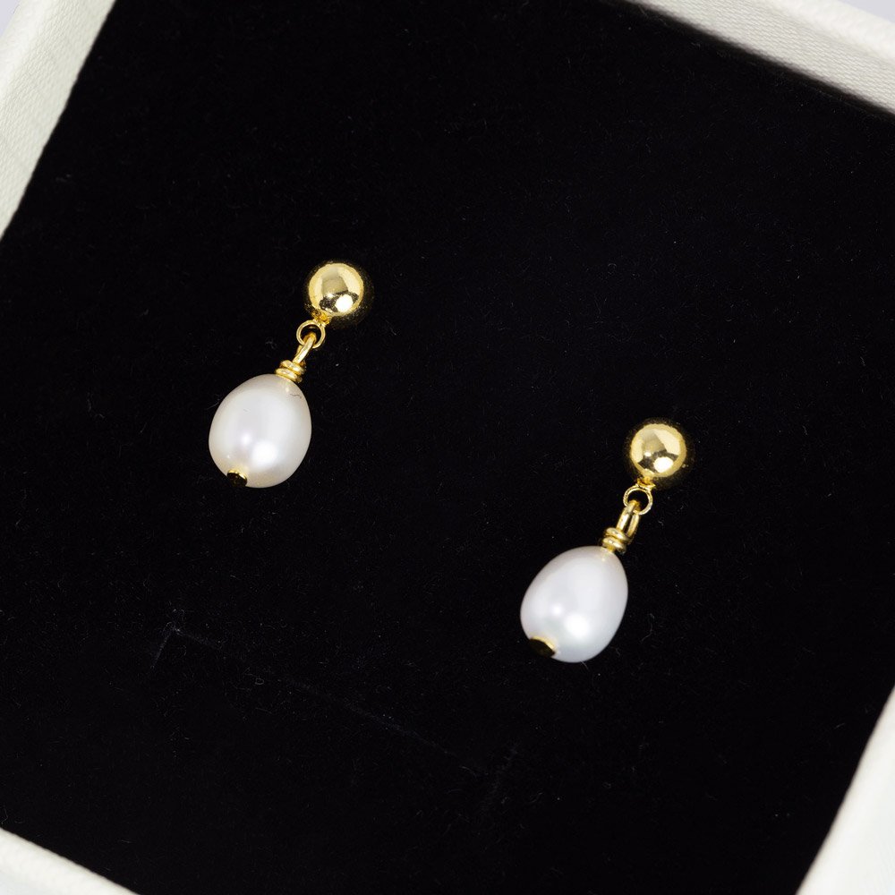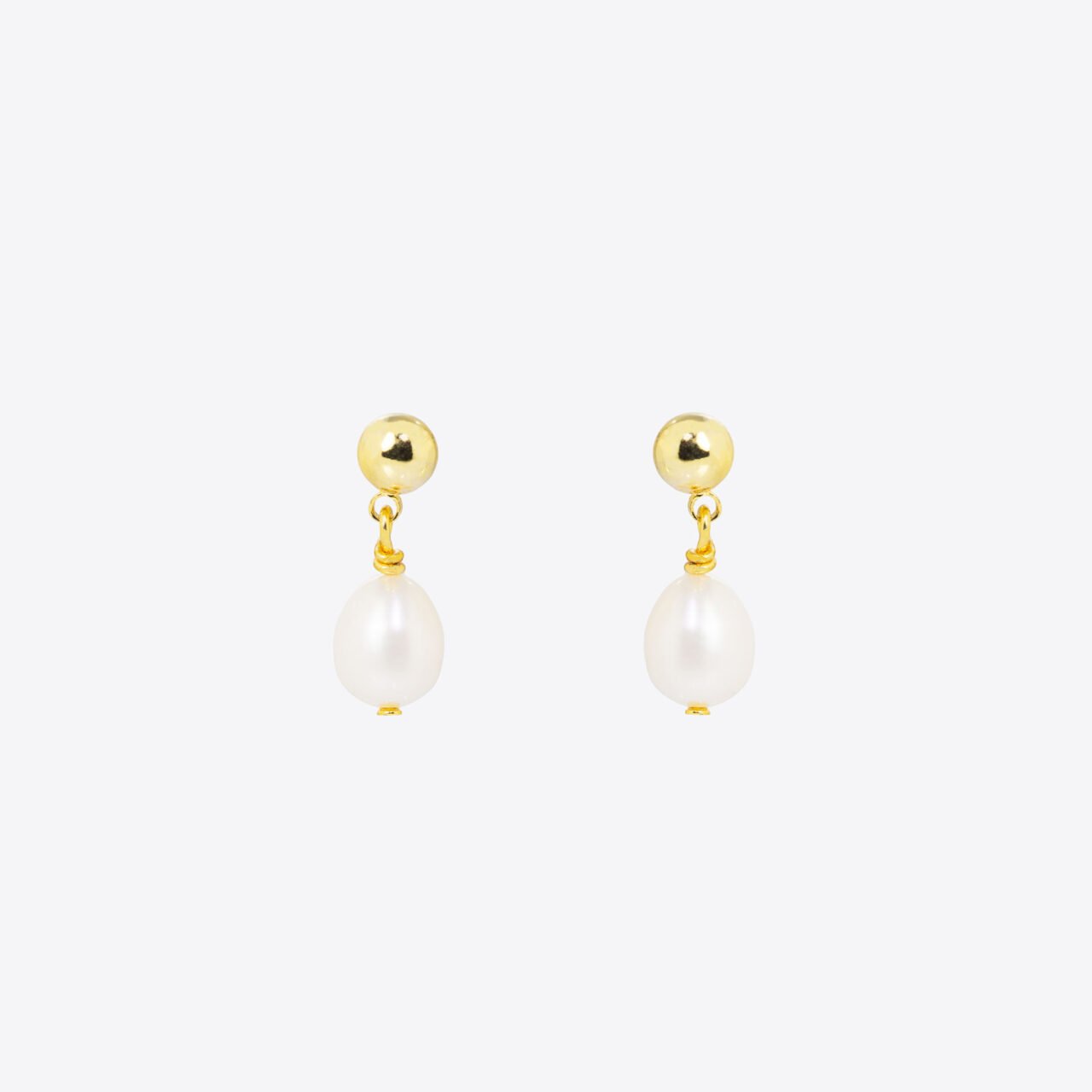 Enhance your jewelry collection with our exquisite gold and freshwater pearl drop earrings. Featuring a lustrous oval freshwater pearl set in a sleek gold sphere design, like a Sunny Doll, to arouse the essence of brightness, joy, and positivity in life.